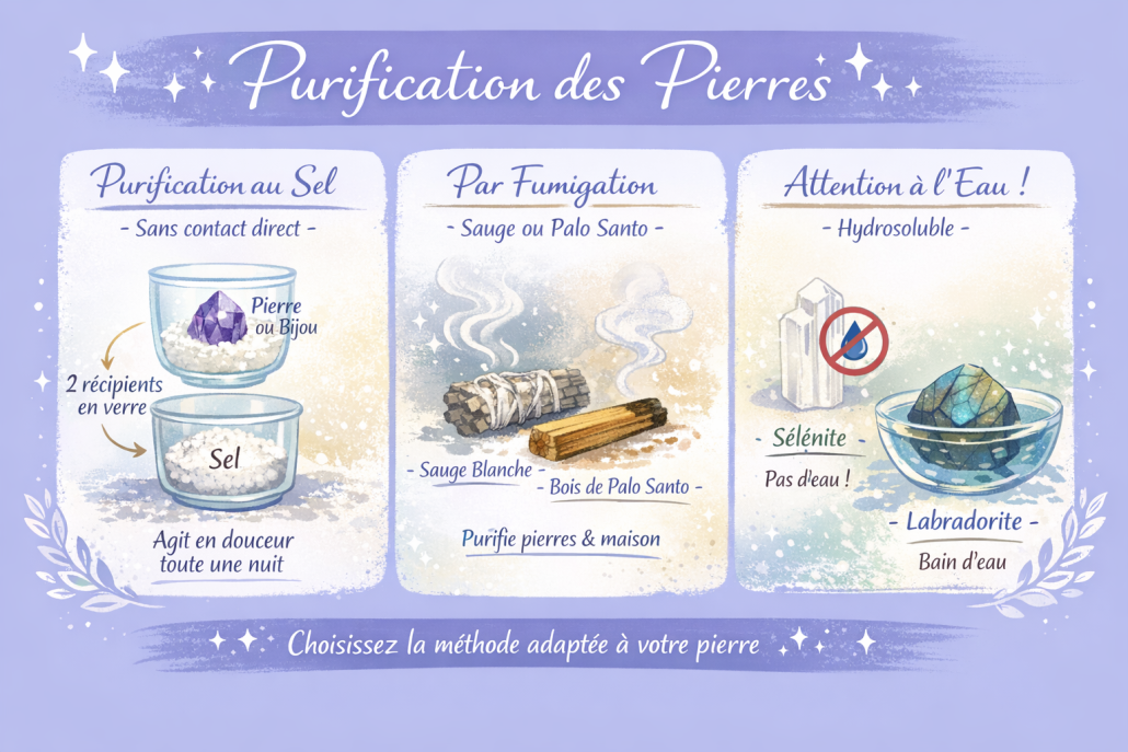 Plusieurs méthodes simples et respectueuses permettent de purifier vos pierres en douceur :