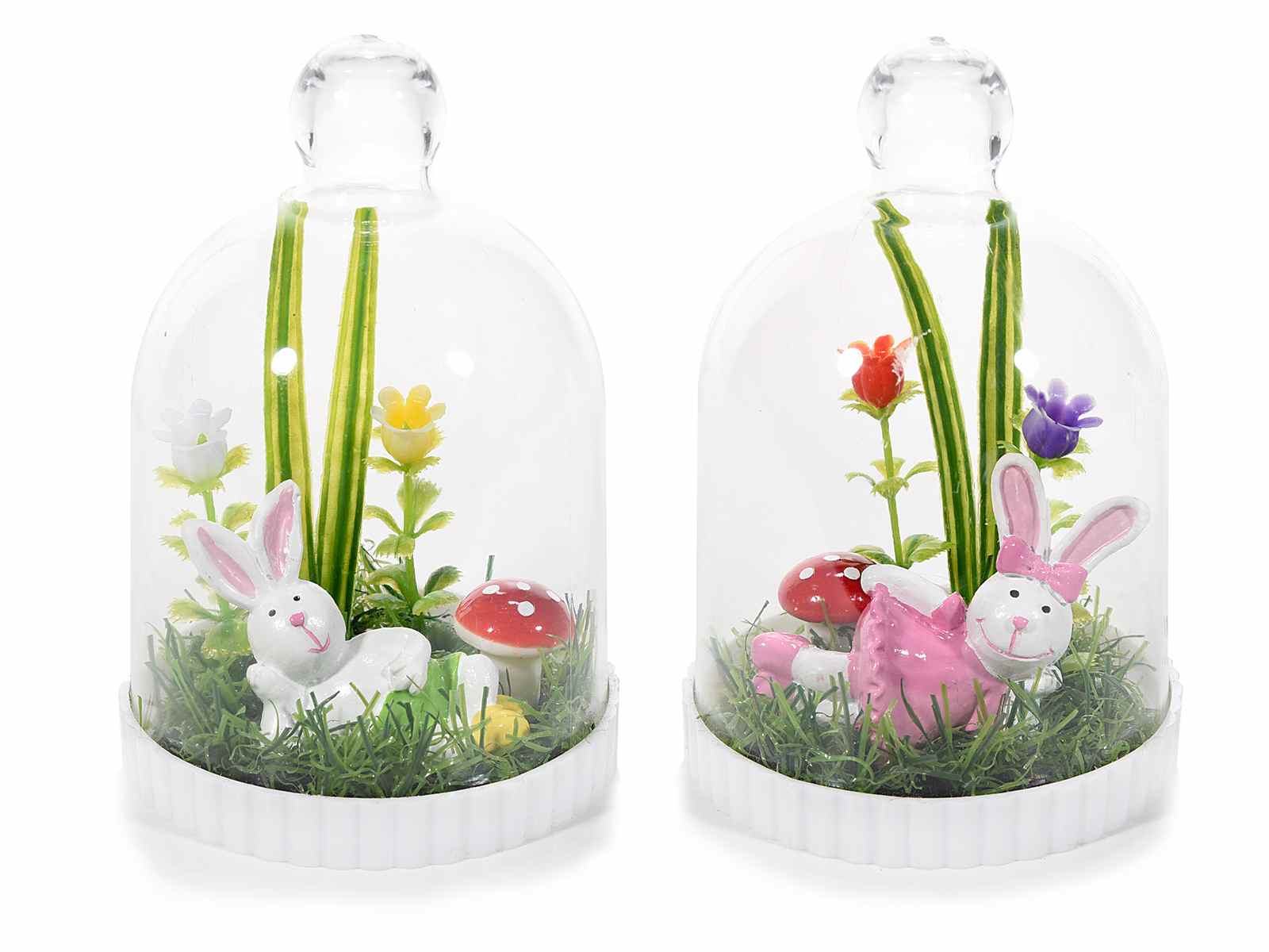 Décoration de pâques, lapin rose, champignon et fleurs sous une cloche. A poser sur une table :)