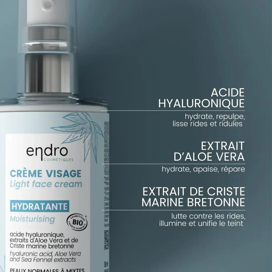 Eau, glycérine, huile de tournesol*, beurre de karité*, humectant, émollients issu de la glycérine et l’huile de coco, huile de graines de lin*, parfum, gomme xanthane, poudre d’arrow root*, acide hyaluronique, extrait d’aloe vera*, extrait de criste marine*, levulinate de sodium (conservateur), tocophérol, anisate de sodium (conservateur), acide lactique (régulateur de pH), émulsionnant.