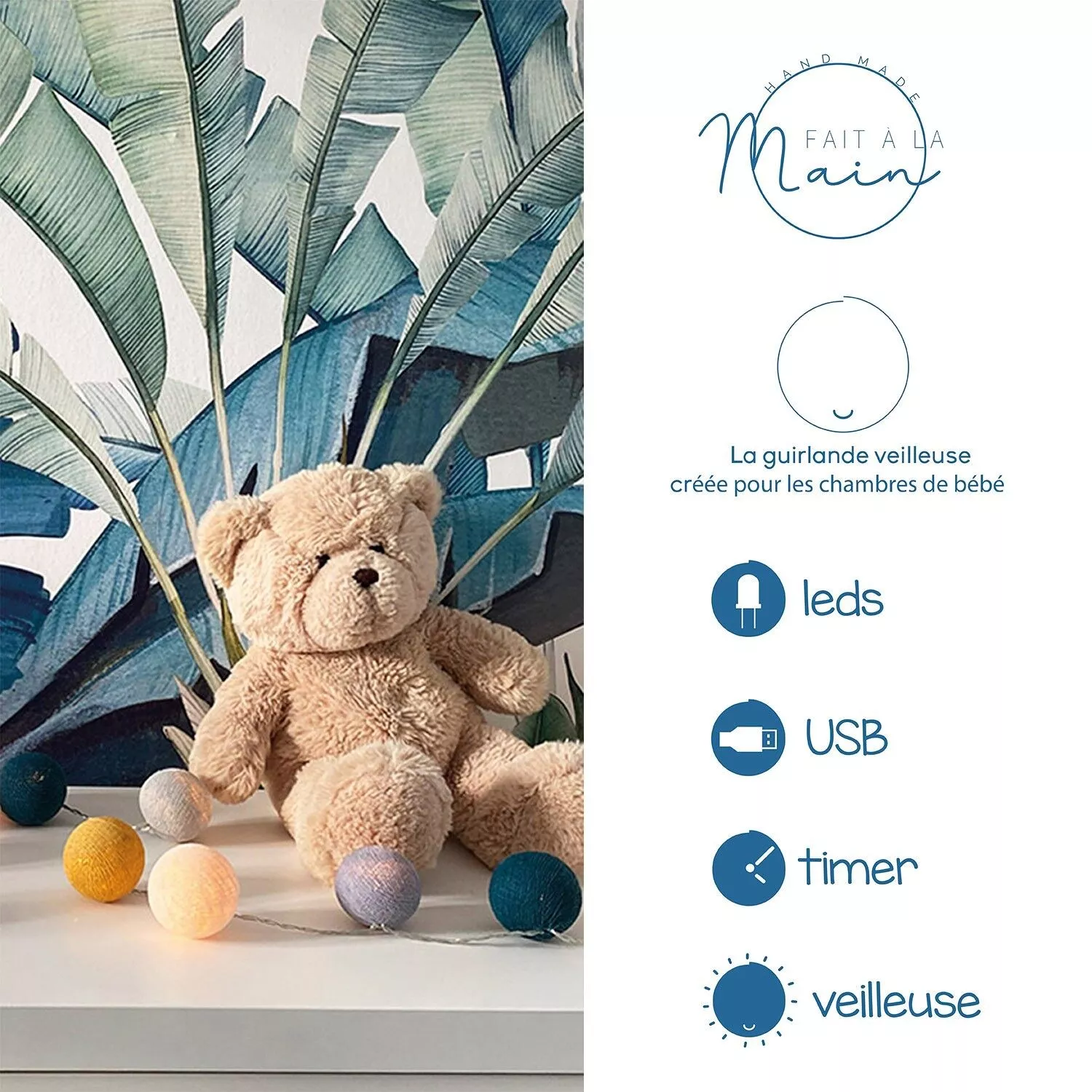 Transformateur USB, interrupteur double fonction : mode timer 3h et mode veilleuse (2 intensités lumineuses : 100% et 50%).