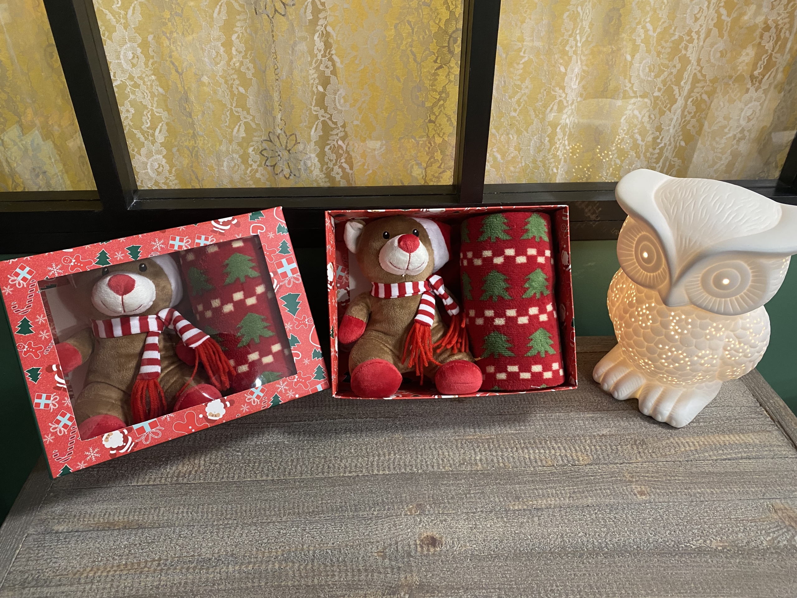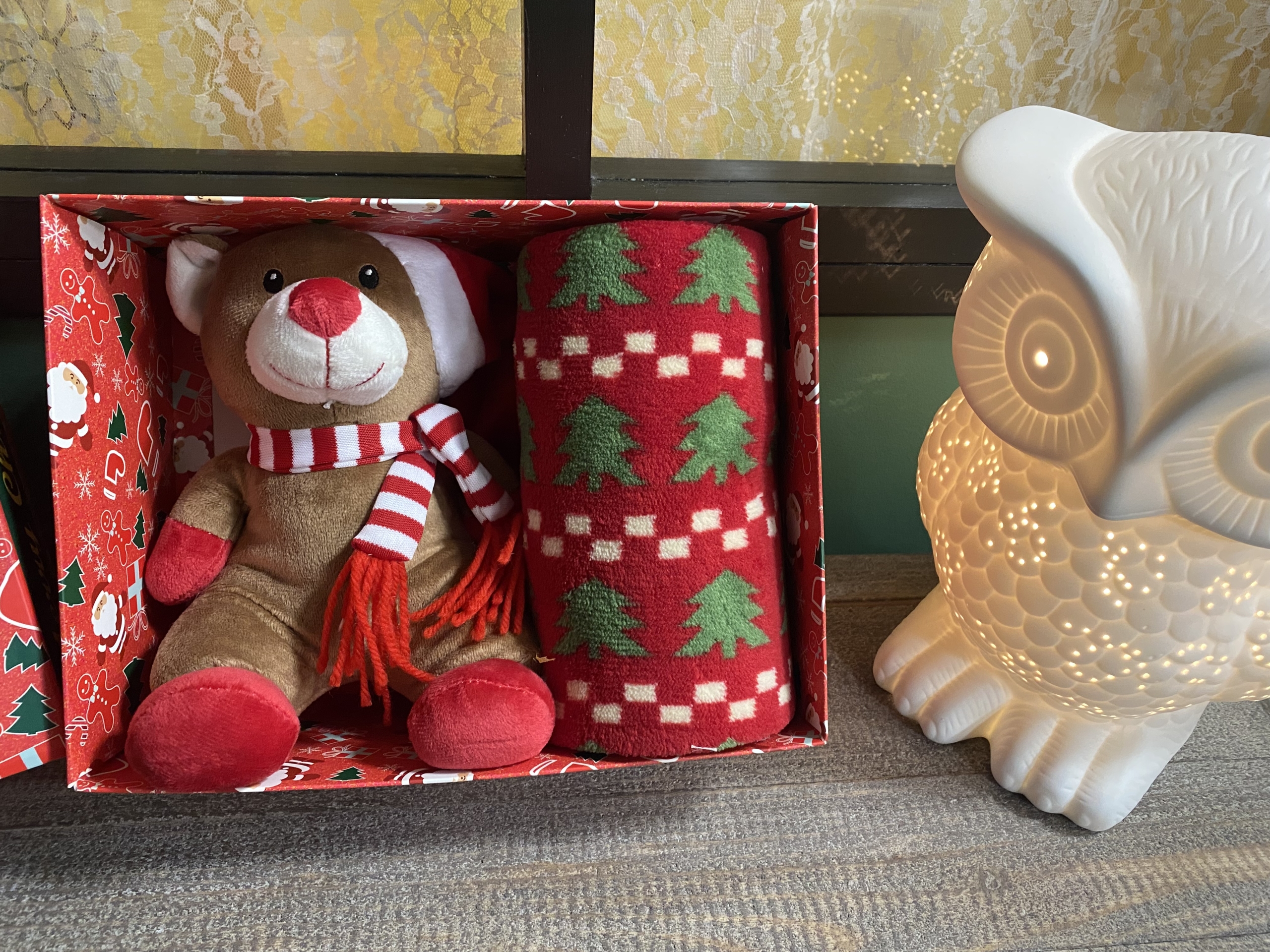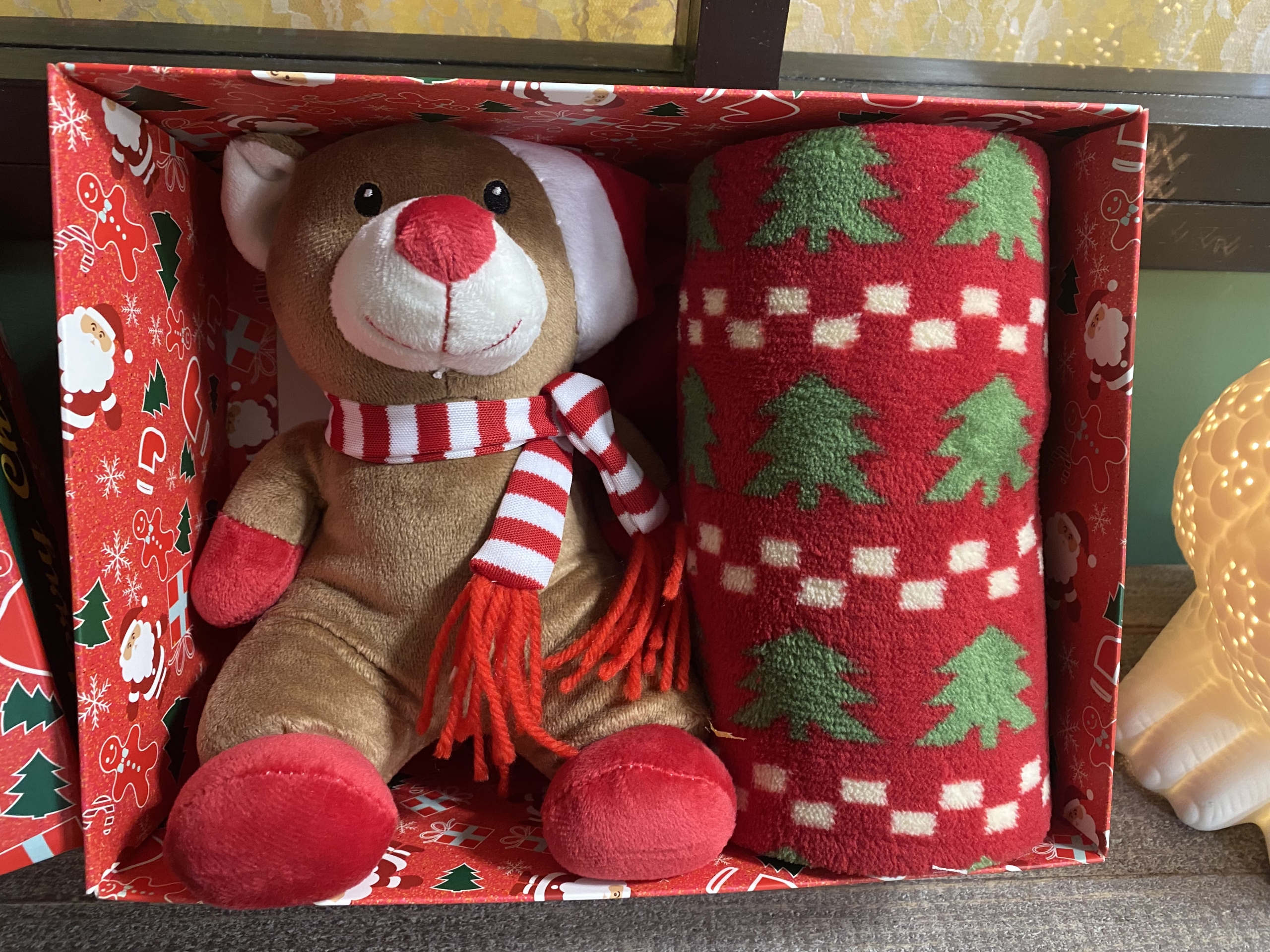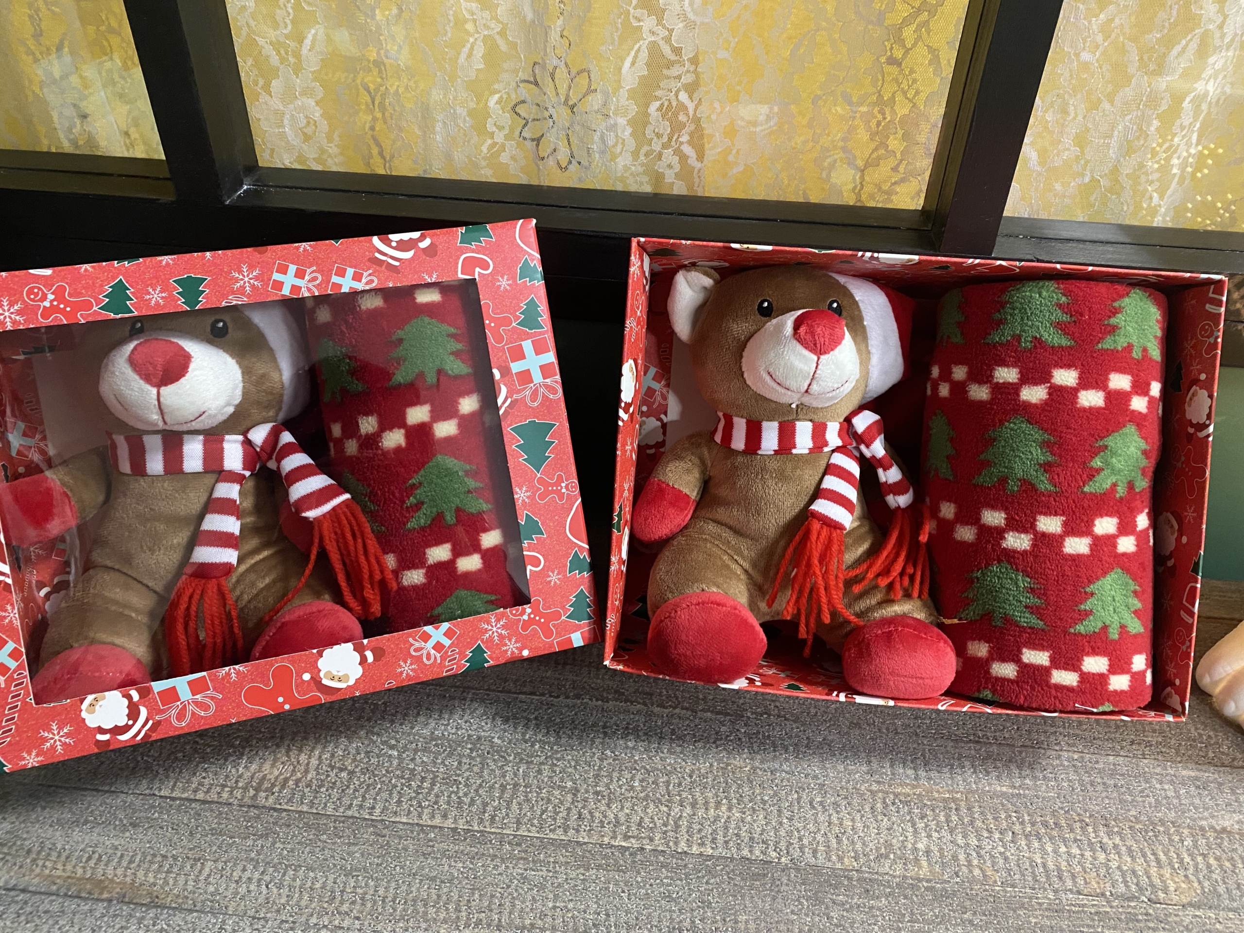 Coffret doudou avec son plaid de 70 x 95 cm 🧸 pour bébé et enfant. couleur rouge/vert/brun