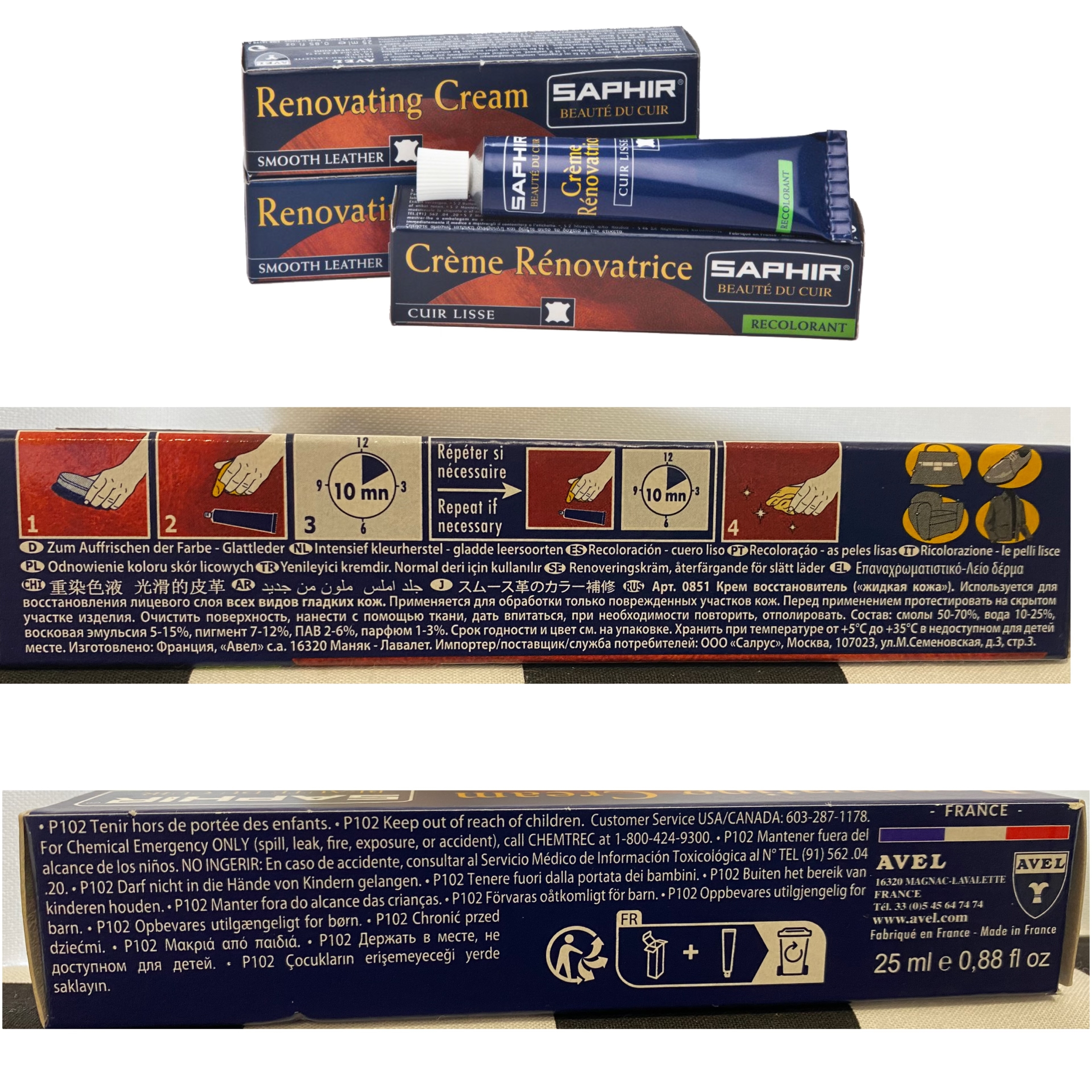 Concentré de pigments. Couvre les éraflures, accrocs, brûlures de cigarettes, redonne de la couleur à tous les cuirs lisses : chaussures, vêtements, maroquinerie et mobilier.