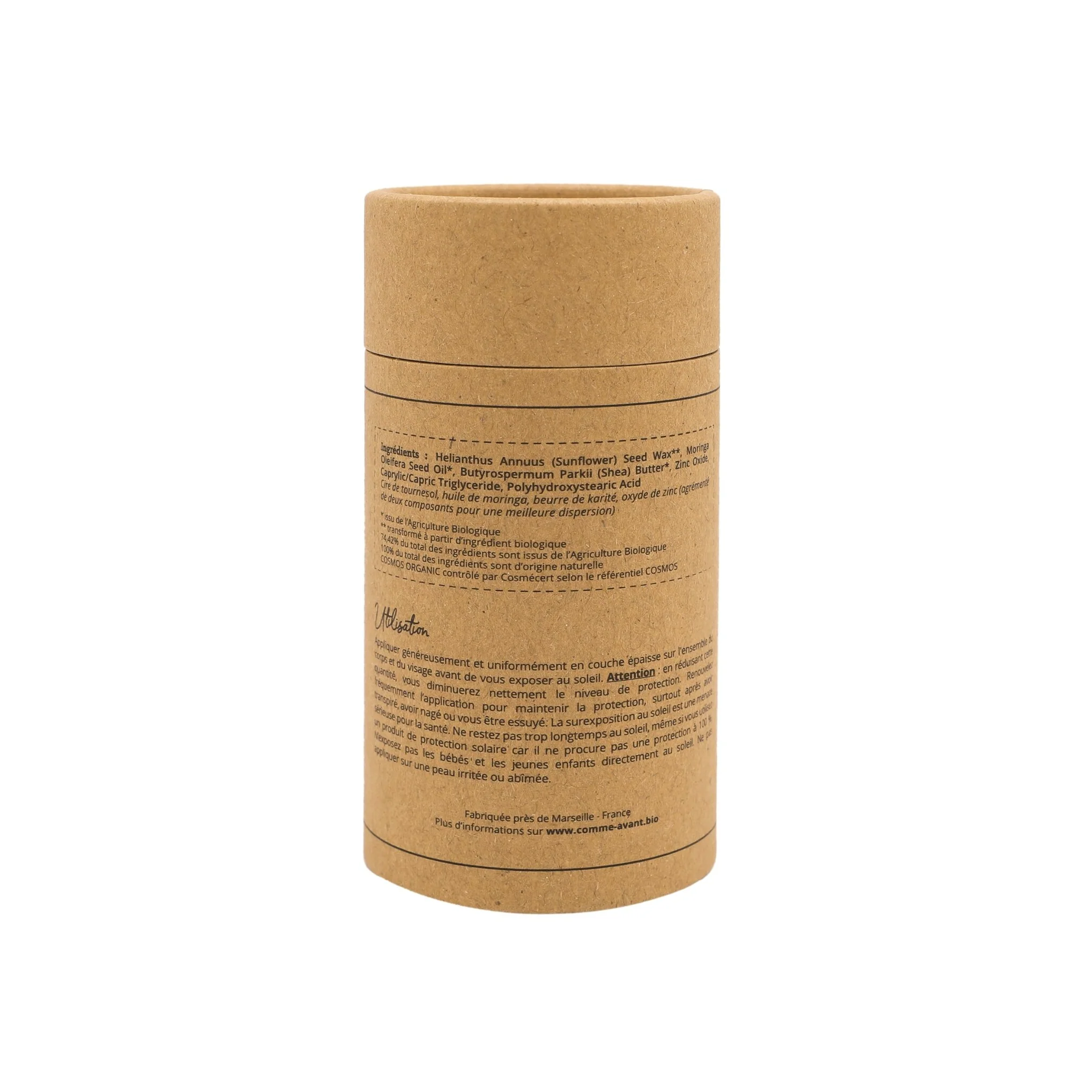 Composition courte : beurre de Murumuru, cire de Tournesol, huile de Moringa et oxyde de zinc (agrémenté de deux composants pour une meilleure dispersion), parfum d’origine naturelle pour la version parfumée