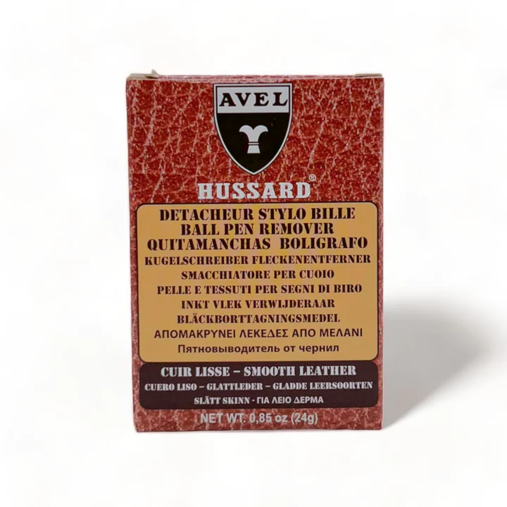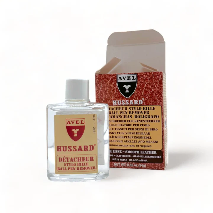 Détacheur spécial taches d’encres de stylos à bille pour cuirs traités (non poreux). S’applique au coton tige sur la tache.
