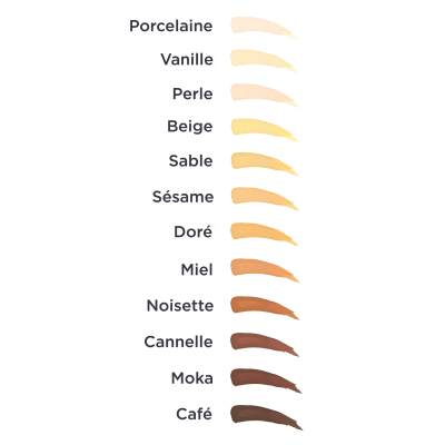 La gamme de fond de teint certifié bio Avril est composée de 11 teintes dans différentes hauteurs de ton :
