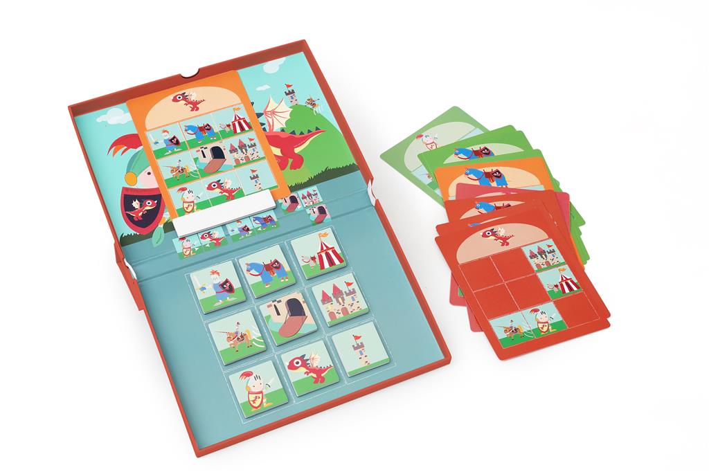 Peux-tu à chaque fois compléter l’image des chevaliers, dragons et châteaux avec les figurines manquantes ? Attention : les figurines qui se trouvent à l’intérieur de la boîte doivent toujours être placées correctement ensemble ! Il y a 18 cartes de mission différentes. Prends une carte de mission et fixe-la à l’aide de l’aimant sur le dessus de l’Edulogic Box. Reproduis la carte de mission en plaçant les bonnes figurines en dessous. Utilise pour ce faire les carreaux magnétiques. Essaie maintenant de remplir les cases vides de la carte de mission en trouvant les bonnes figurines manquantes. Observe pour cela la série au milieu de l’Edulogic box. Qui/qu’est-ce qui peut être associé ? Par exemple, le chevalier doit toujours être placé à gauche du dragon (ou le dragon à droite du chevalier), le chevalier bleu doit être placé à gauche du cheval bleu (ou le cheval bleu à droite du chevalier bleu) et la porte du château doit être placée à gauche du château ou sous le château. Tu as pu compléter le tableau ? Retourne la carte de mission et vérifie sur la carte des solutions si tu as bien exécuté la mission. Ce jeu stimule la logique.