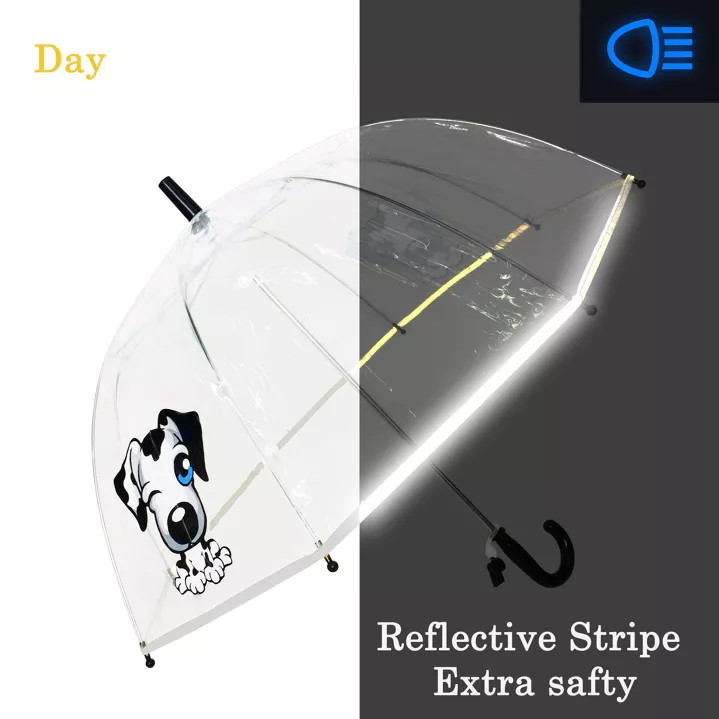 Ce parapluie transparent est muni d’un liseré fluorescent qui réfléchira la moindre source de lumière pour le rendre toujours visible même une fois la nuit tombée. Le système d’ouverture et fermeture est manuel et adapté à sa force pour lui éviter toute mauvaise surprise. La cloche transparente lui permettra, en plus d’admirer son nouvel ami, de ne pas se sentir gêné par la toile pour voir autour de lui. De plus, cela l’encouragera à bien se couvrir jusqu’aux épaules avec son parapluie cloche.