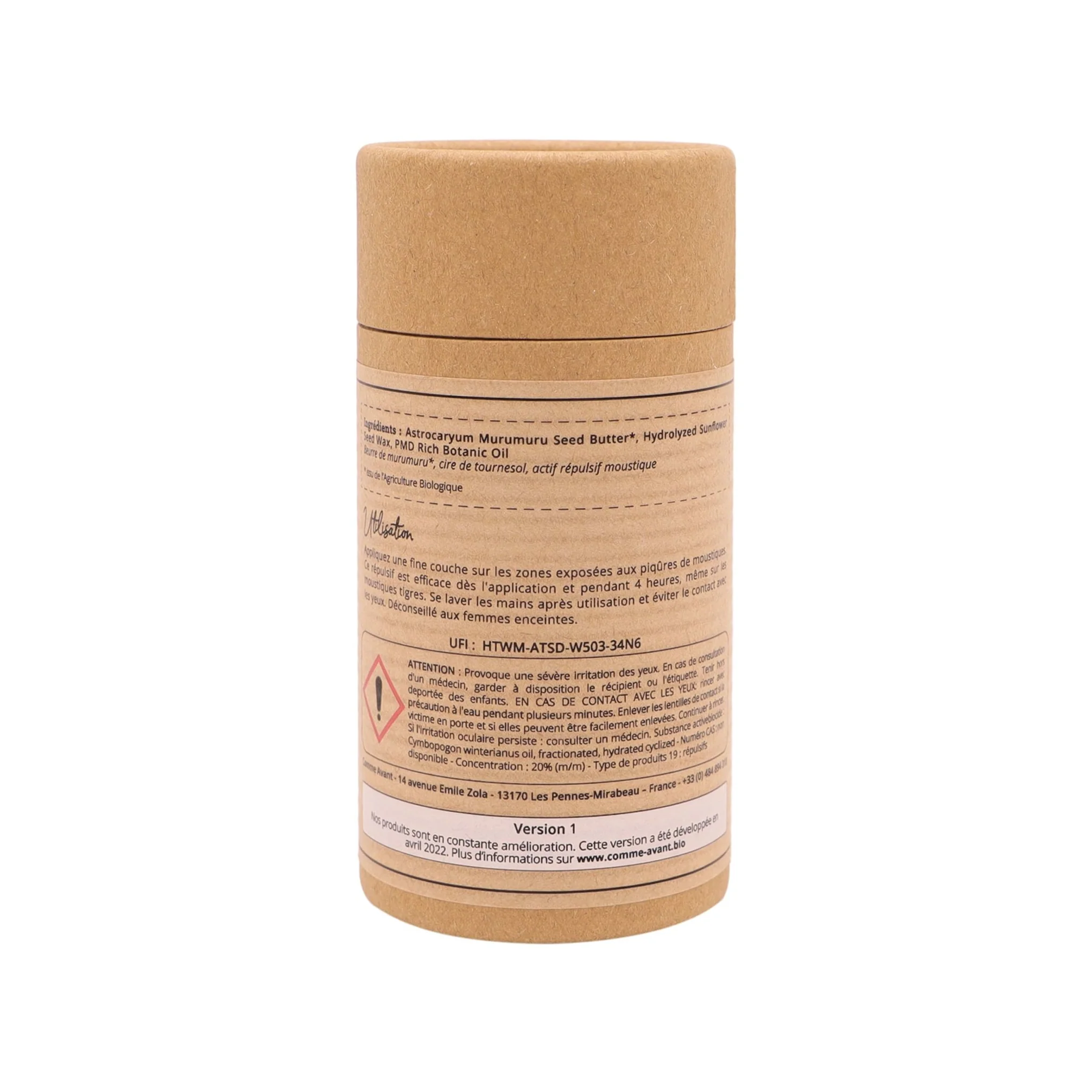 - Composition courte : beurre de murumuru, cire de candelilla, PMD (actif anti-moustique)
