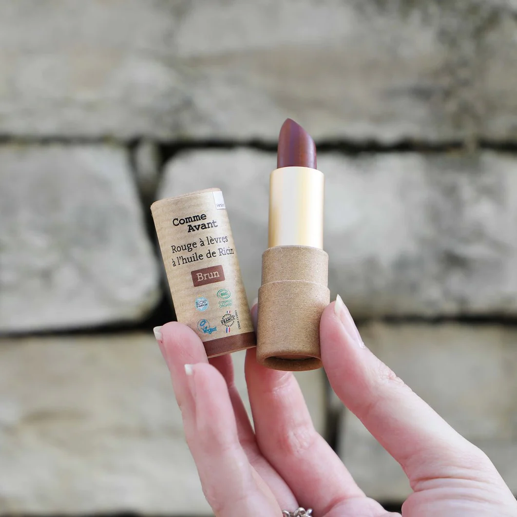 Composition courte : beurre de murumuru, cire de candelilla, pigment minéral, émollient présent dans le pigment, huile de ricin, agent filmogène végétal