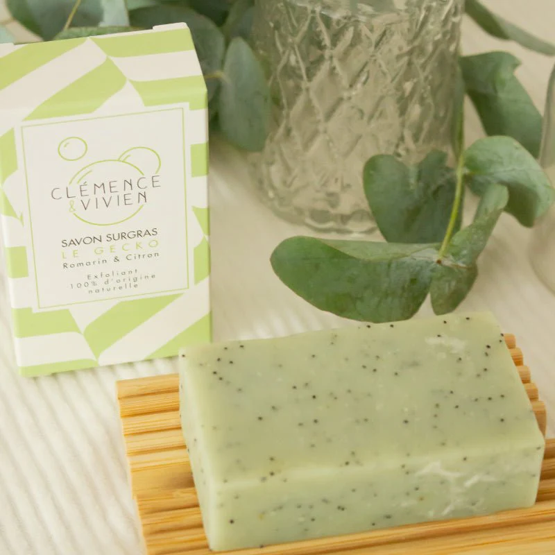 Ingrédients : butyrospermum parkii butter (huile de karité)*,cocos nucifera oil (huile de coco)*, sodium hydroxyde (hydroxide de sodium), aqua (eau) , olea europaea fruit oil (huile d’olive)*, helianthus annuus seed oil (huile de tournesol)* ,ricinus communis seed oil (huile de ricin)*., illite (argile verte), rosmarinus officinalis leaf oil (huile essentielle de romarin), citrus limon peel oil (huile essentielle de citron), papaver somniferum seed (graines de pavot), limenene**, linalol**, citral**