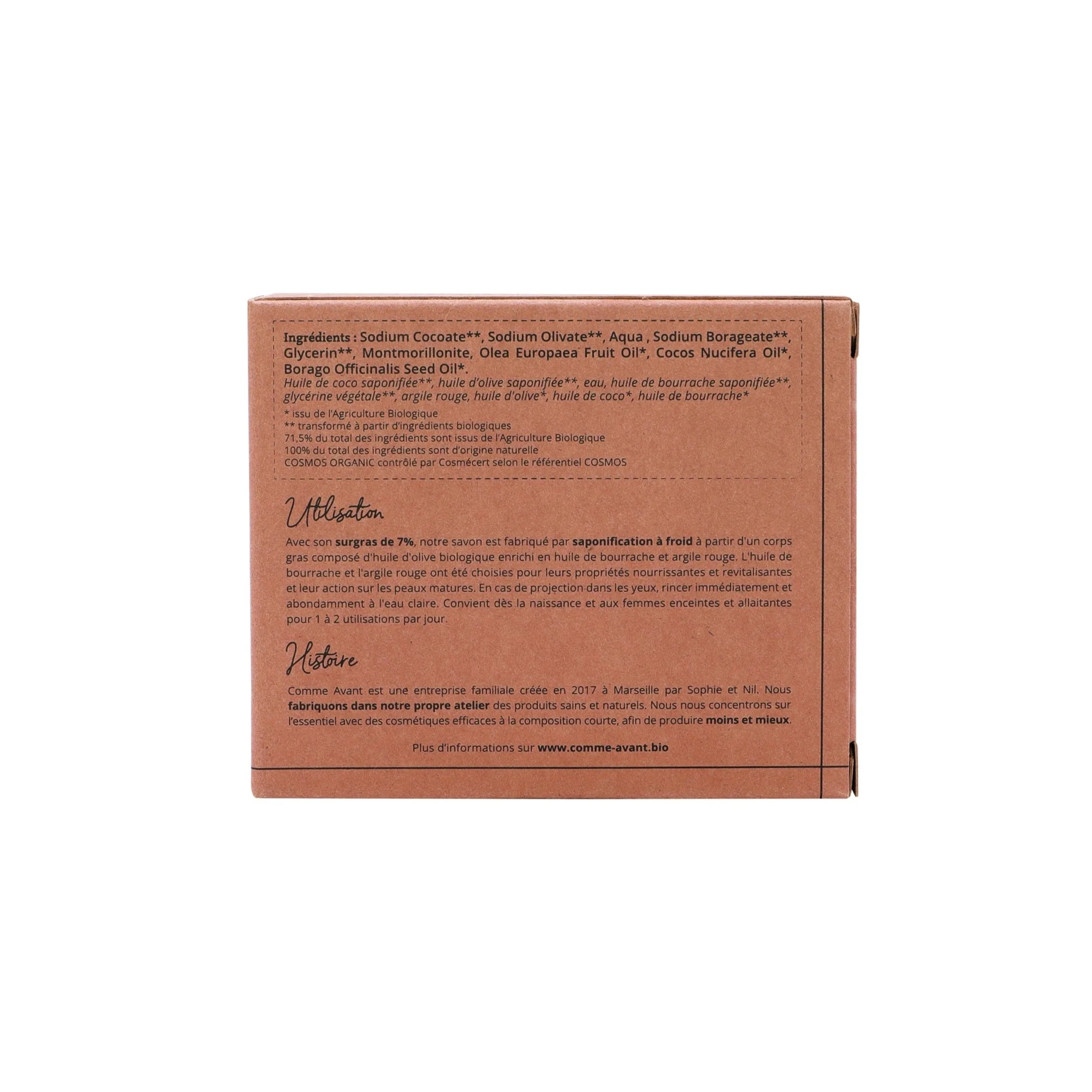 Composition courte : huile de coco saponifiée, huile d’olive saponifiée, eau, huile de bourrache saponifiée, glycérine végétale, argile rouge, huile d’olive, huile de coco, huile de bourrache