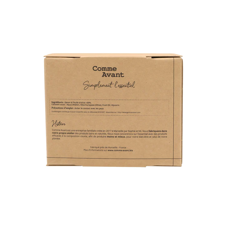 Composition courte : huile d’olive saponifiée, eau, huile d’olive en surplus, glycérine végétale