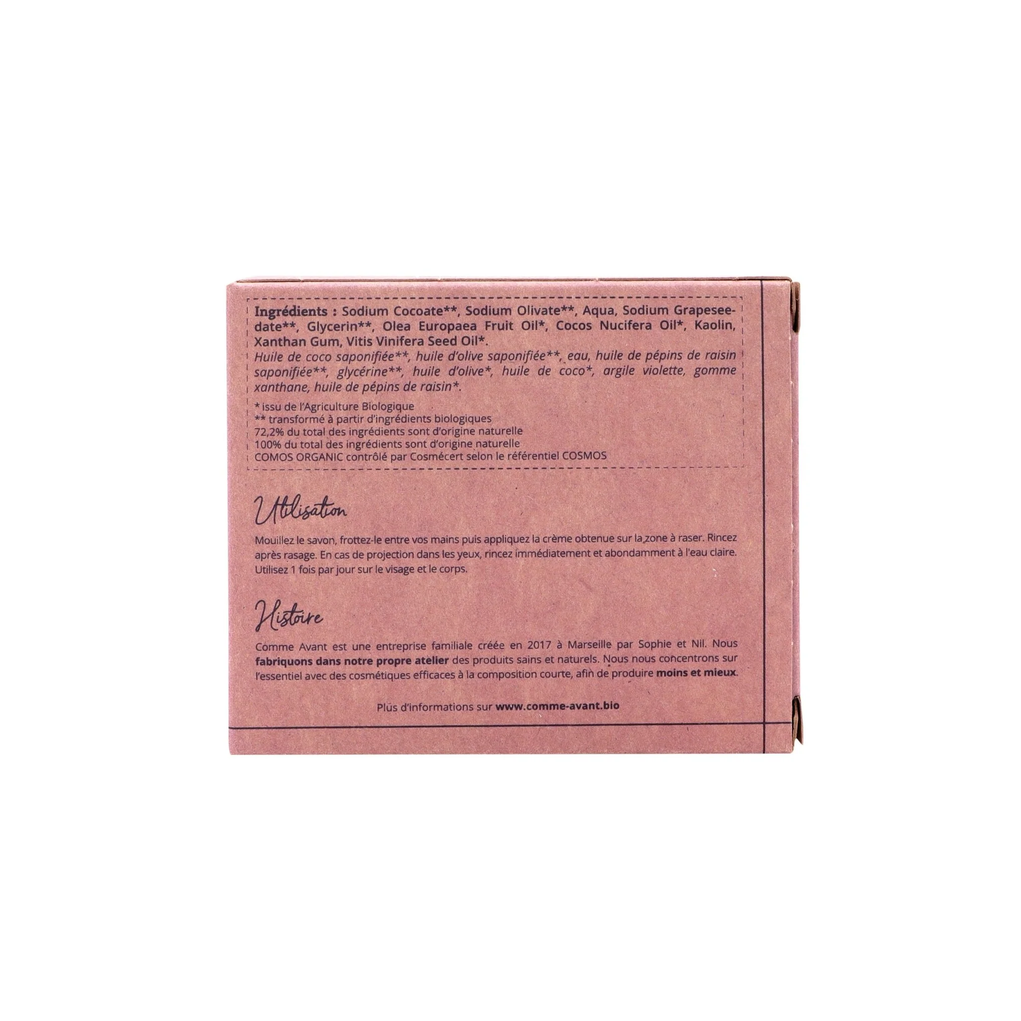 Composition courte : huile de coco saponifiée, huile d’olive saponifiée, eau, huile de pépins de raisins saponifiée, glycérine végétale, huile d’olive, huile de coco, argile violette, gomme xanthane, huile de pépins de raisin